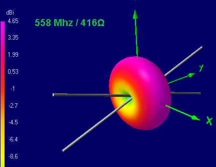 Конструкция паразитных элементов и согласование антенны исходят из свойств вибратора. Свойства полуволнового диполя отлично известны и широко описаны. Сопротивление излучения равно 73Ω на центральной частоте, диаграмма направленности почти круговая, с небольшим усилением 2.15 dBi перпендикулярно оси.