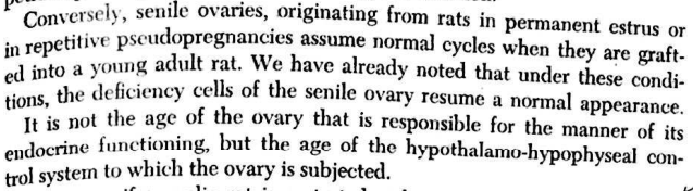 В принципе, понимание того, что менопауза наступает не из-за износа репродуктивной системы или истощения запасов яйцеклеток, было у ведущих геронтологов ещё в 1950–70 годах. Дильман, Эверитт, Фролькис, Ашхайм об этом писали более полувека назад. Вот цитата из так любимой мной книги 1977 года “Гипоталамус, гипофиз и старение”: