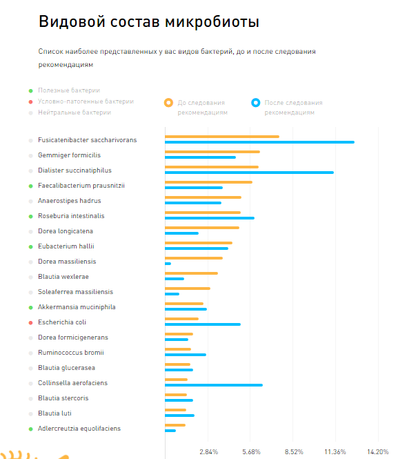 Благодаря нашим рекомендациям некоторым участникам удалось повысить представленность полезных бактерий, сделать микробиоту более сбалансированной и даже сменить один кластер микробиоты в другой. Например, из третьего типа с преобладающей «западной» диетой и фастфудом — во второй, более вегетарианский.
