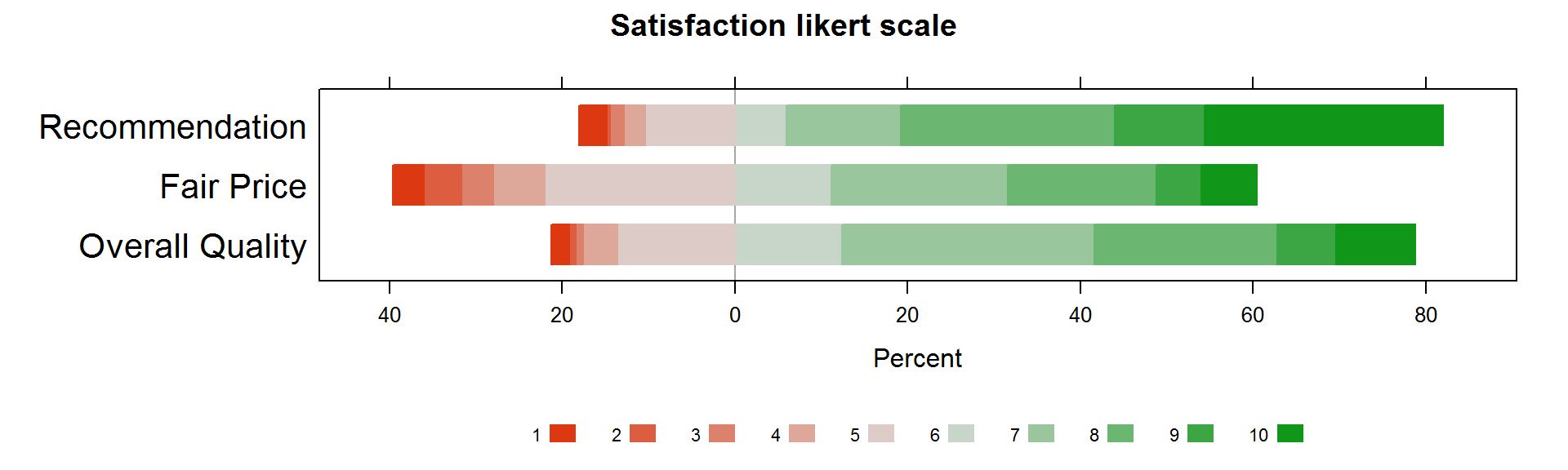 Рассмотрим реальный пример — исследование «индекс удовлетворенности европейских клиентов рынком услуг мобильной связи» за 2005 год. Данные доступны в пакете semPLS среды R. Каждая переменная опроса представляет рейтинг со шкалой от 1 до 10. Из этих данных мы рассмотрим только три переменные — оценка мобильного провайдера при его рекомендации друзьям или коллегам (Recommendation); оценка обоснованности платы за услуги (Fair Price); оценка качества услуг предоставляемых мобильным оператором (Overall Quality). Сводка результатов опроса по этим переменным показана ниже.