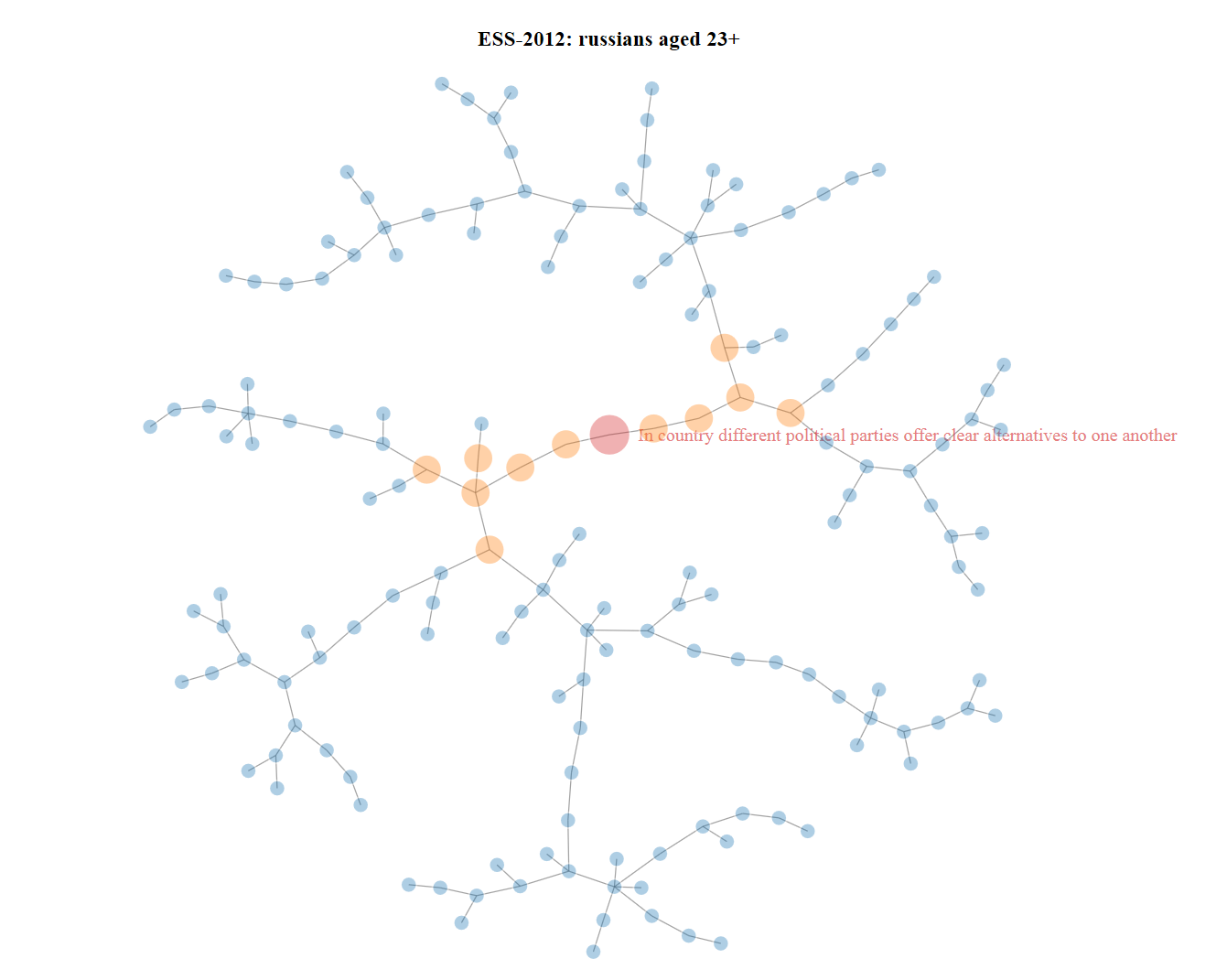 Подходящим решением вопроса по отбору переменных в GCGM для заданной переменной является построение минимального дерева взаимной информации (дерево Chow-Liu). Это быстрый алгоритм, описание которого в этой публикации не входит в мои планы. Детали можно найти в статье [7]. Структурное свойство дерева Chow-Liu, нестрого говоря, состоит в следующем — чем ближе между собой две вершины в этом дереве, тем они «более зависимы». Поэтому находим в дереве целевую переменную, определяемся с радиусом и выбираем все подходящие вершины этого дерева. Пример ниже построен для целевой переменной «В России политические партии предлагают избирателям по-настоящему разные программы», со шкалой ответов от 0 до 10. Дерево из примера было построено с использованием R библиотеки NetworkD3 (создает ряд d3.js графиков).