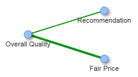 Обратите внимание, коэффициент корреляции между переменными Recommendation и Fair Price, с учетом влияния переменной Overall Quality, оказался очень малым. Парная корреляция между этими переменными равная 0,4 уменьшилась, в случае частичной корреляции между ними, до 0,02.