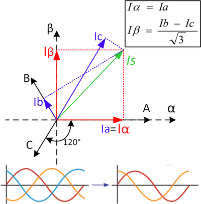 Рисунок 6. Координатные преобразования из неподвижных осей α и β, привязанных к статору двигателя, к вращающимся осям осям d и q, привязанных к ротору
