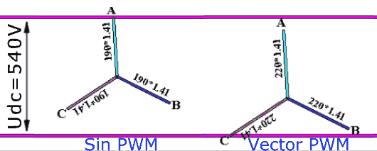 Посчитаем. Пусть у вас есть классический преобразователь частоты, питающийся от промышленной трехфазной сети 380В 50Гц. Здесь 380В это линейное (между фазами) действующее напряжение. Так как в преобразователе стоит выпрямитель, он выпрямит это напряжение и на шине постоянного тока окажется напряжение, равное амплитудному линейному напряжению, т.е. 380∙√2=540В постоянного напряжения (по крайней мере без нагрузки). Если мы применим синусоидальный алгоритм расчета в модуле ШИМ, то амплитуда максимального фазного напряжения, которое получится у нас сделать, окажется равной половине от напряжения на шине постоянного тока, т.е. 540/2=270В. Пересчитаем в действующее фазное: 270/√2=191В. А теперь в действующее линейное: 191∙√3=330В. Теперь можем сравнить: вошло нам 380В, а вышло 330В… И больше с этим типом ШИМ никак нельзя. Для исправления этой проблемы используется так называемый векторный тип ШИМ. В нем на выходе будут снова 380В (в идеальном случае без учета всех падений напряжения). Векторная ШИМ никакого отношения к векторному управлению электродвигателем не имеет. Просто в его обосновании снова используется немного школьной геометрии, поэтому он и называется векторным. Однако его работу на пальцах не объяснить, поэтому отправлю читателя к книжкам (в конце статьи) или к википедии. Могу еще привести картинку, которая немного намекает на разницу в работе синусоидальной и векторной ШИМ (Рисунок 10):
