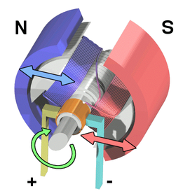 При вращении ротор сам переключает свои части обмоток, меняя приложенное к ним напряжение, при этом ток в роторе протекает переменный. Коммутатор располагают таким образом, чтобы магнитный поток ротора и статора снова оказывался близким к 90 градусам, дабы достичь максимума момента. Такие двигатели по наивности называют двигателями постоянного тока, но совершенно незаслуженно: внутри-то, после коллектора, ток все равно переменный!