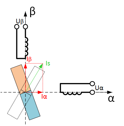 На рисунке ротор расположен в произвольном положении, но из этого положения ротор будет стремиться повернуться согласно магнитному потоку статора, т.е. по вектору Is (положение ротора в этом случае показано пунктирной линией). Соответственно, если подать ток только в фазу α, скажем, Iα = 1А, ротор встанет горизонтально, а если в β, вертикально, а если приложить Iβ = -1А то перевернется на 180 градусов. Если запитать ток Iα по закону синуса, а Iβ по закону косинуса от времени, то будет создано вращающееся магнитное поле. Ротор будет следовать за ним и крутиться (как стрелка компаса следует за вращением магнита руками). Это базовый принцип работы синхронной машины, в данном случае двухфазной с одной парой плюсов.