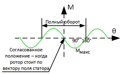 Чтобы получить этот график на практике, можно поставить на вал ротора датчик вращающего момента, затем включить любой вектор тока, например, просто подать ток в фазу α. Ротор повернется в соответствующее положение, которое нужно принять за ноль. Потом через датчик момента «руками» нужно поворачивать ротор, фиксируя на графике в каждой точке угол θ, на который повернули, и момент, который показал датчик. Т.е. нужно растягивать «магнитную пружину» двигателя через датчик момента. Самый большой момент окажется при угле в 90 градусов от вектора тока (от начала). Амплитуда получившегося максимального момента Ммакс пропорциональна амплитуде приложенного вектора тока. Будет приложен 1А, получим, скажем, Ммакс = 1 Н∙м (ньютон*метр, единица измерения вращающего момента), если подадим 2А, получим Ммакс = 2 Н∙м.