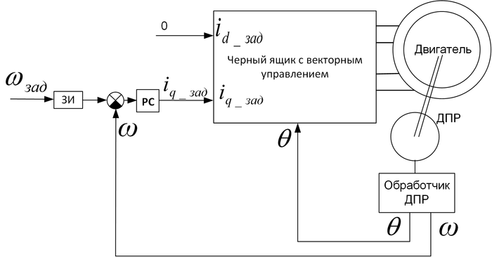 Здесь ЗИ – задатчик интенсивности, плавно изменяет свой выход, чтобы двигатель разгонялся с нужным темпом, а не гнал на полном токе до задания скорости. Текущая частота вращения ω взята из обработчика датчика положения ротора, так как ω это производная от углового положения ϴ. Ну или можно просто время между импульсами датчика засекать…