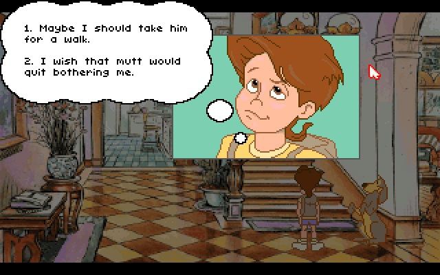 В меню выбора диалогов присутствовали только значки, поэтому шутки нельзя было прочитать заранее, что создавало в сценарии, наверно, страннейшую несуразицу фраз во всей истории видеоигр. Возьмём, например, случай, когда антропоморфный пёс Сэм говорит (совершенно спонтанно): «Моё сознание — это вихрь миазмов блестящих мыслей и высокопарных идей».