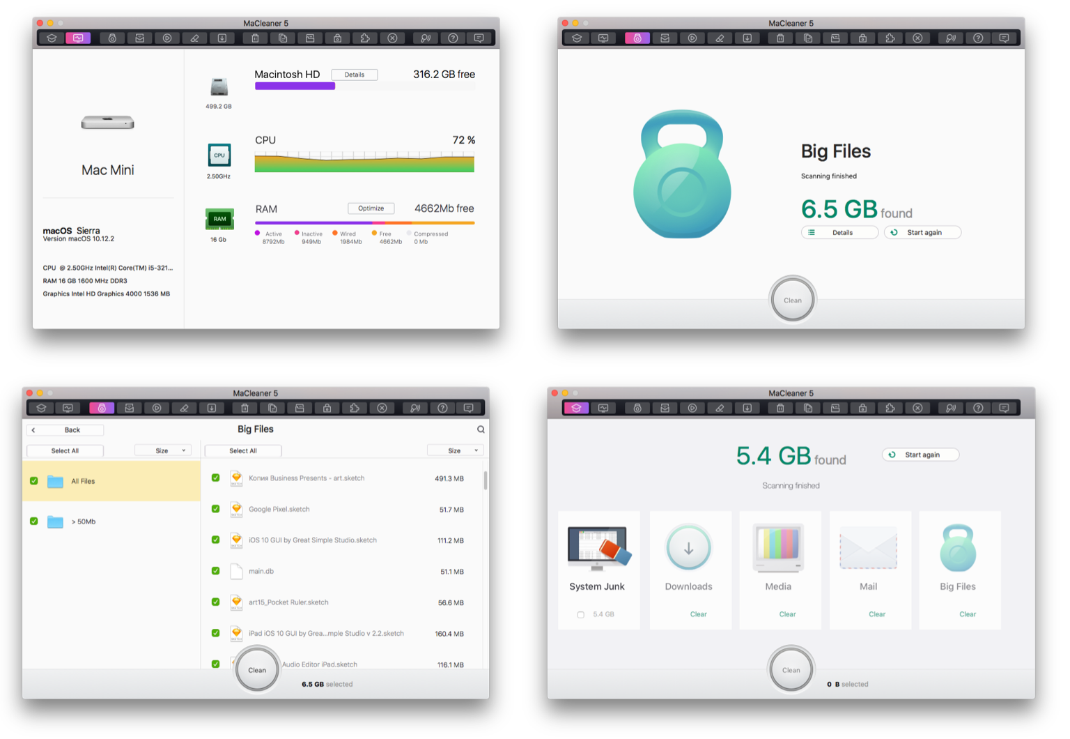 Всего мы отобрали пять претендентов из разных ценовых категорий — WireframSketcher, Flair Builder, Balsamiq Mockups, Make My App и Pencil Project. Из-за специфических требований рабочего процесса нас интересовали только варианты с возможностью работы оффлайн и доступной версией для Mac. Предпочтение отдавалось старым и зарекомендовавшим себя программам, однако в виде исключения взят был также молодой проект Make My App, с которым нам уже приходилось работать. Чтобы в полной мере оценить и сравнить возможности, мы выбрали 4 разных экрана из нашего оптимизатора для Mac MaCleaner 5 и попробовали воссоздать их средствами каждой из программ.