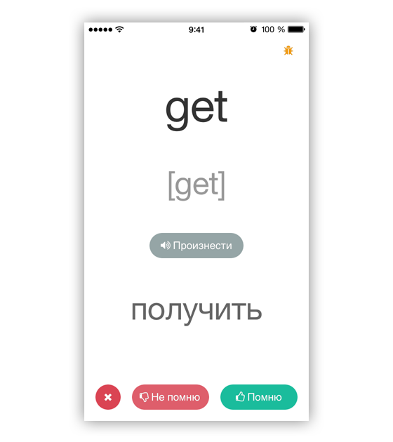 Взаимодействие с программой достаточно простое: вы видите слово, его транскрипцию и перевод. Каждое слово может быть озвучено (я использую встроенный в iOS синтезатор речи, что позволило существенно сократить размер приложения). Когда вы изучаете новое слово, вам доступны два действия: либо вы будете в дальнейшем повторять это слово, либо оно вам уже известно (не будете его повторять).