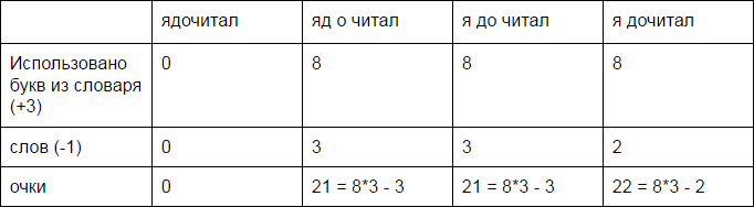 Для этого введем функцию оценки полученного разбиения. Будем выдавать очки за использованные буквы и слова. +3 очка за букву и -1 очко за слово. Чтобы было использовано как можно больше букв с как можно меньшим количеством слов.