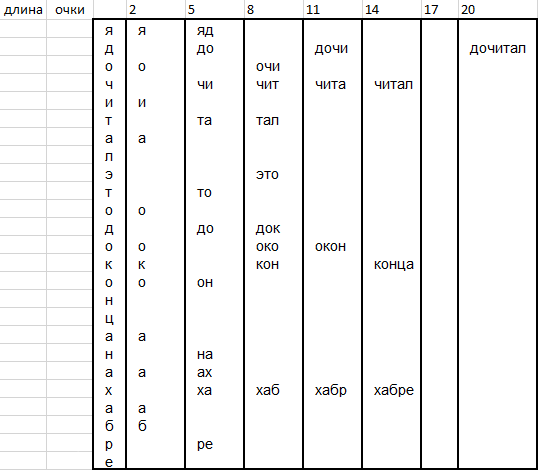 Итак, нам понадобится словарь (желательно, чтобы по нему можно было ходить по буквам). И пример-строка: “ядочиталэтодоконцанахабре”.