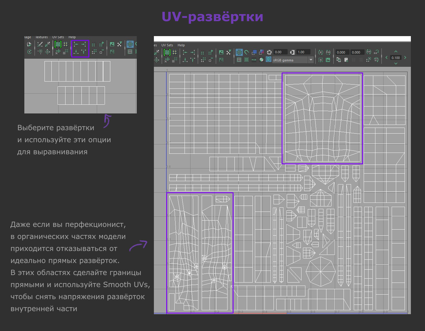 Создание чётких и упорядоченных UV уже стало неотъемлемой частью моего рабочего процесса, к тому же это делается очень просто. От художника требуется только не растягивать текстуру в некоторых областях.