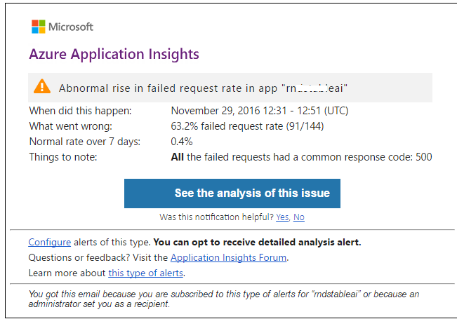 В состав AI входит компонент ProactiveDetection, который на основе алгоритмов машинного обучения способен определять аномалии в собираемой телеметрии. Например, количество запросов к вашим сервисам резко возросло или упало, увеличилось количество ошибок или суммарная длительность некоторых операций.