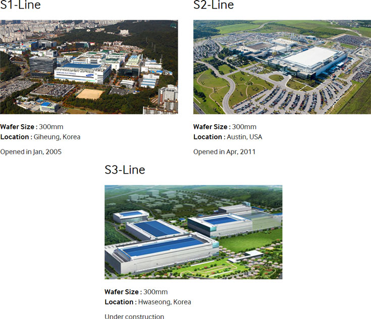 По данным источника, Samsung выпускает контрактную продукцию на трех фабриках: S1 работает с 200-миллиметровыми пластинами, S2 и S3 — с 300-миллиметровыми. Производительность S1 оценивается в 190 000 пластин в месяц, S2 и S3 — в 135 000-140 000 пластин в месяц суммарно. Отметим, на сайте производителя сказано, что все предприятия работают с 300-миллиметровыми платинами. При этом S1-Line и S2-Line показаны как работающие, S3-Line — как строящееся.