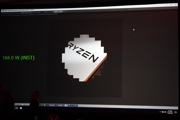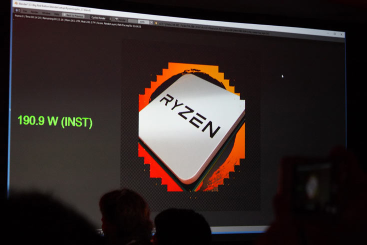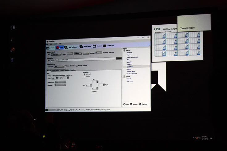 Производитель сравнил инженерный образец Ryzen, работающий на частоте 3,4 ГГц, с процессором Intel Core i7-6900K, работающим на частоте 3,2 ГГц. Процессоры показали примерно равную скорость конвертации видео в приложении HandBrake.