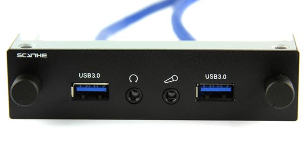 На панели Scythe Kaze Station II находится два разъема портов USB 3.0, которые рассчитаны на подключение к штырьковым разъемам на системной плате. Кроме того, конструкторы нашли место для двух регуляторов скорости вращения вентиляторов и двух звуковых разъемов диаметром 3,5 мм. Один предназначен для подключения наушников, второй — микрофона.