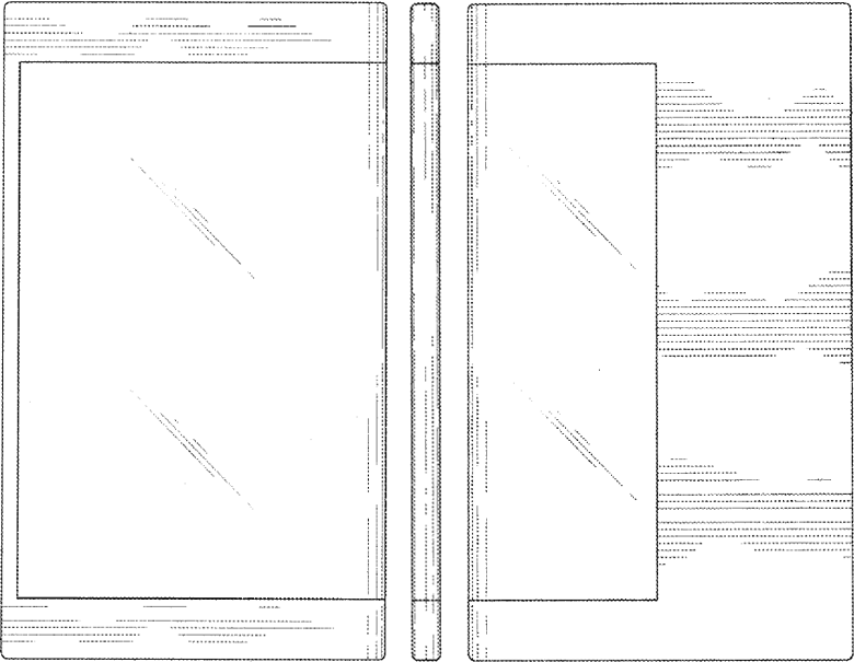 На иллюстрациях к патенту запечатлено устройство с дисплеем, покрывающим большую часть корпуса. Занимая почти всю переднюю панель, экран огибает одну из боковых граней и покрывает значительную часть задней панели.