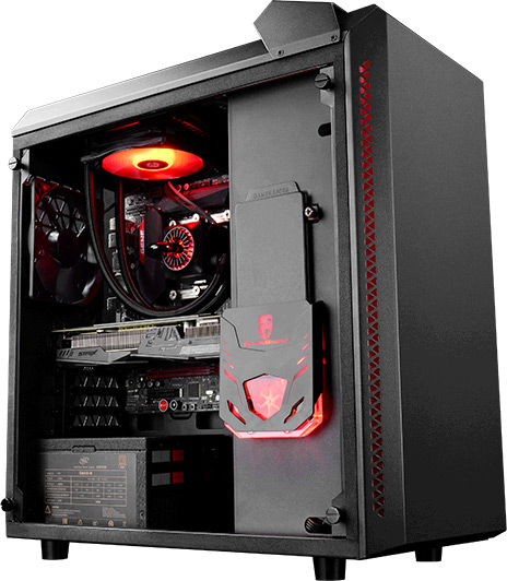 Если говорить о вентиляторах, для них есть восемь посадочных мест. Один 120-миллиметровый вентилятор производитель устанавливает сам. Корпус украшен светодиодной подсветкой.