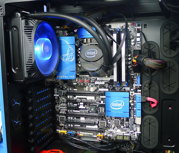 Фото Intel DZ87KL-75K в корпусе в составе собранной системы малоинформативно, однако спецификации системной платы уже известны. Она оснащена четырьмя слотами для модулей оперативной памяти DDR3-2400 МГц (максимум ОЗУ – 32 ГБ), тремя слотами PCI Express x16, а также тремя слотами PCI x1, одним PCI и одним Mini PCI Express.