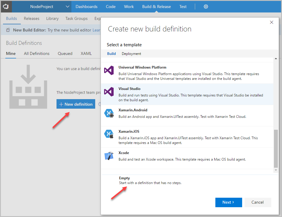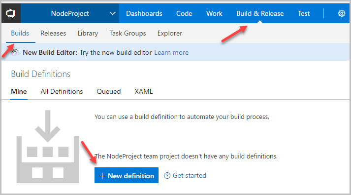 - создание нового Build Definition