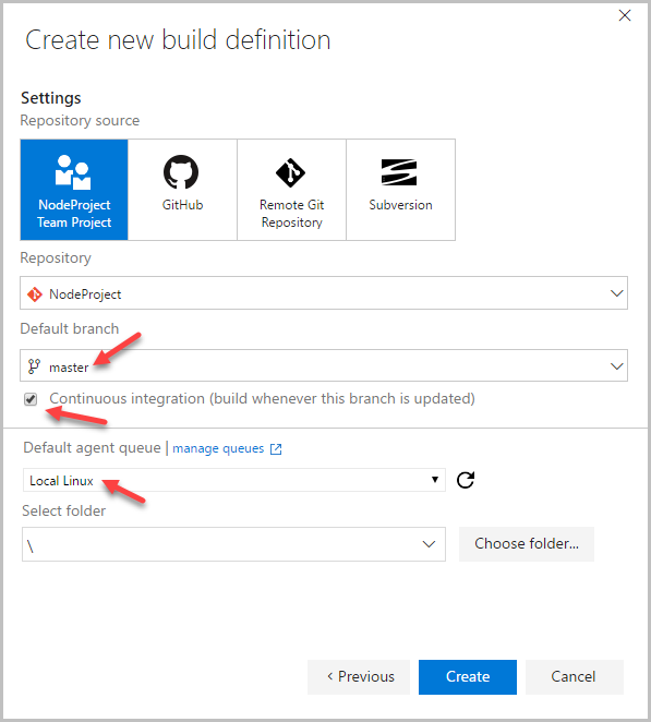 На следующем шаге нас попросят определиться, на какой ветке репозитория мы будем делать Build и будем ли мы его делать автоматически по факту обновления этой ветки, т.е. будем ли мы собственно и использовать CI. Тут также надо указать пул агентов, настроенный в пункте 6.