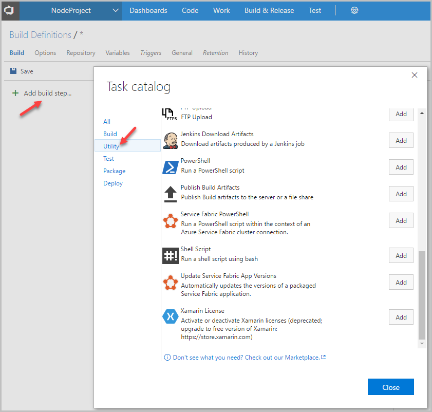 - добавление шагов в Build Definition