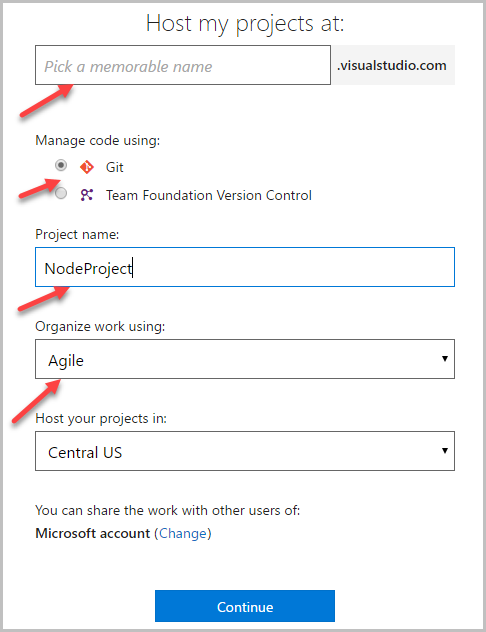 При создании учетной записи VSTS нужно также создать свой первый проект. При заполнении формы важно не забыть нажать на ссылку «Change details», чтобы выбрать название проекта и методику управления (Organize work using). Название проекта можно будет поменять после его создания, а вот методику управления уже нет.