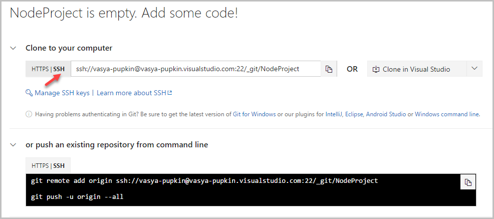 Обратите внимание, что по умолчанию VSTS предлагает работать по протоколу https. Я рекомендую работать по SSH. Первоначальная настройка может занять чуть больше времени, но дальнейшая работа будет сильно удобней.