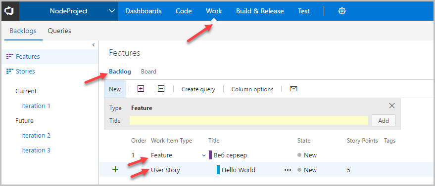 Создадим в основном меню «Work» Feature с заголовком «Веб сервер» и в ней User Story с заголовком «Hello world».