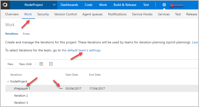 Для реализации нашего проекта одной итерации будет достаточно. Поскольку по умолчанию в VSTS настроены заглушки для трех итераций, мы не будем создавать новые, а будем настраивать текущие. Настройка заключается в придумывании имени и указании дат начала и конца итерации. Делается это в настройках уровня проекта в меню «Work».