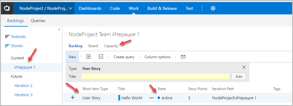 После создания итерации надо указать, какие задачи во время этой итерации мы будем решать. Обычно это делается в первый день итерации. Мы сделаем это сейчас. У нас всего одна задача (User Story), поэтому ее и надо перетащить мышкой в только что созданную итерацию. После того, как вы приступили к задаче, ей надо поставить статус Active. Для использования разных «фишек» Agile имеет смыл также заполнить для текущей итерации раздел Capacity.