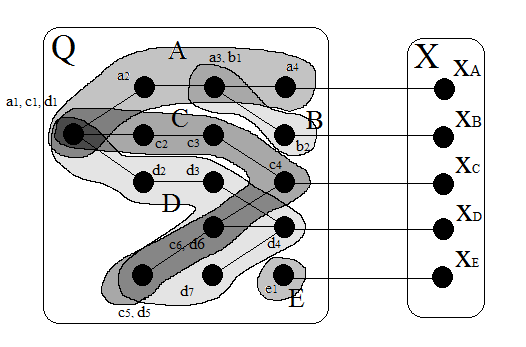 Теперь представим такие файлы, как — как множество однотипных элементов Q. Также определим все процессы или контейнеры, которые будут существовать в нашей системе, составим множество X. Каждому такому процессу соответствует какой-то исполняемый файл, который в свою очередь зависит от других элементов файловой системы. Будем считать такие множества A, B, C, D и E проекциями процессов (элементов множества X) на множестве Q.