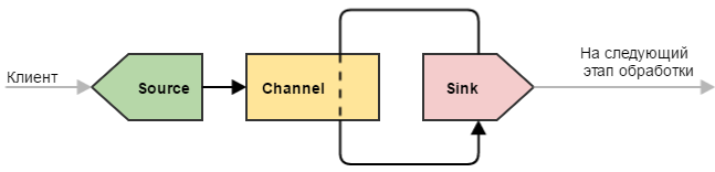 - Канал (channel) — компонент, выполняющий роль буфера при транспортировке данных. Канал является пассивным компонентом, он самостоятельно не инициирует никаких действий. Источники добавляют события в канал, в то время как стоки его опустошают.