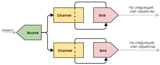 Более сложный пример, который может быть использован для разделения данных. Здесь ситуация немного другая по сравнению с одиночным стоком: наш канал опустошают два стока. Это приводит к тому, что поступающие события делятся между двумя стоками (не дублируются, а именно делятся). Такую конфигурацию можно использовать, чтобы разделить нагрузку между несколькими машинами. При этом, если одна из конечных машин выйдет из строя и привязанный к ней сток не сможет отправлять на нее события, другие стоки продолжат работу в штатном режиме. Естественно, что при этом работающей машине придется отдуваться за двоих.