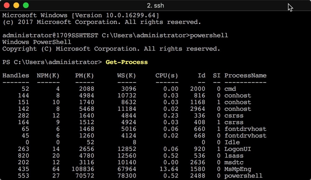 Подключение успешно выполняется, можно работать как с CMD, так из Powershell из привычного для вас окружения с самой современной Windows Server версии 1709.