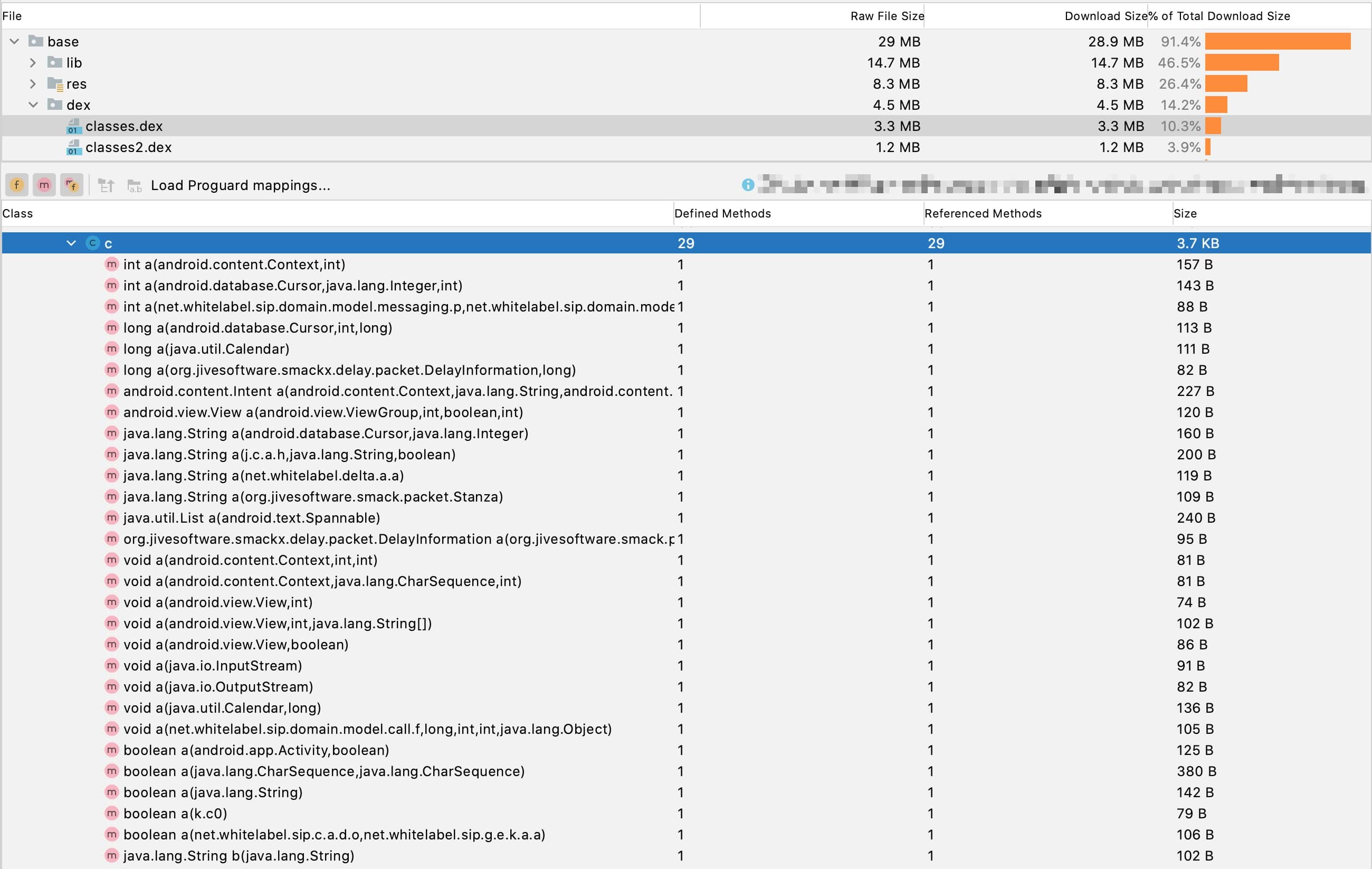 Тут видно, что очень много методов класса com.exampe.feature.c имеют одно и то же имя - a(отличия только в аргументах и в типах возвращаемого значения, так что их сигнатуры уникальны). Чтобы убедиться, что это действительно так, посмотрим на байткод этого класса из бинарного файла приложения. Это можно сделать, например, из AndroidStudio: