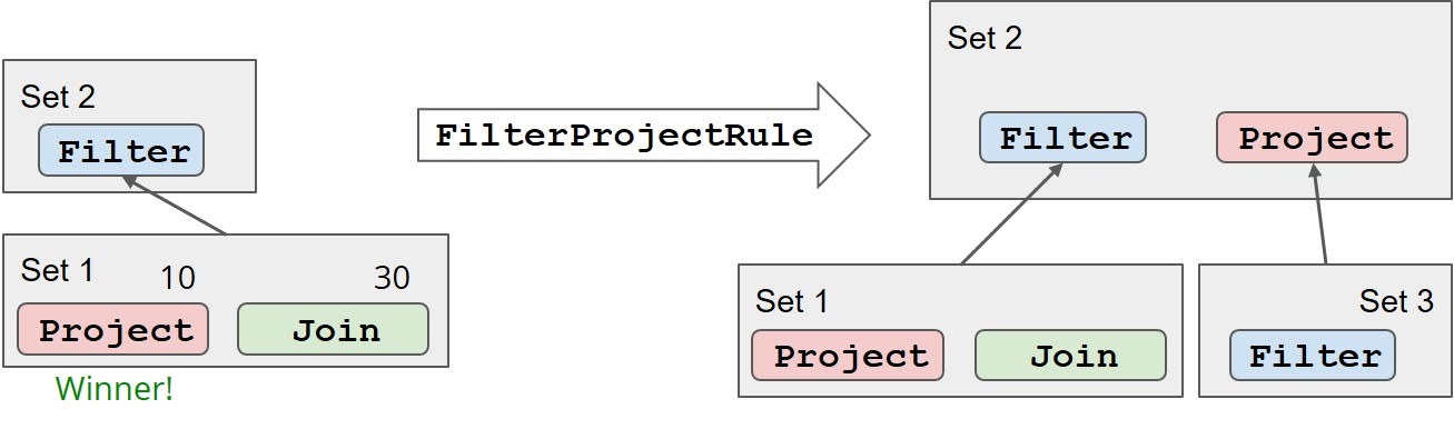 Так как Join отдает абсолютно те же строчки и тот же результат, что и Project, VolcanoPlanner помещает их обоих в один класс эквивалентности Set. И на запрос отдает всё, что находится в одном сете. Filter, соответственно, тоже имеет свой сет. И тогда не важно, что будет его дочерним узлом — мы говорим, что это будет сам сет. Теоретически любой узел может подойти на должность поставщика данных для Filter.