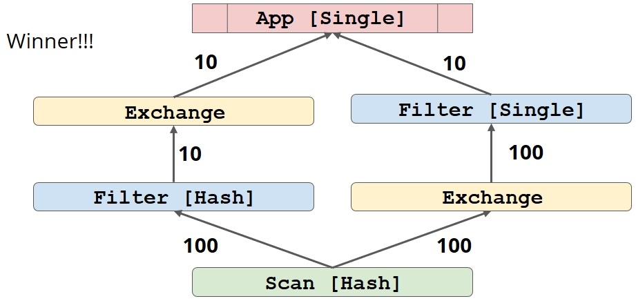 Здесь верхний узел имеет трейт Single, то есть он исполняется всего на одной ноде. У нижнего узла — трейт распределения Hash, то есть данные как-то партицированы по хэшу первичного ключа. Задача оптимизатора — определить, какой трейт должен иметь фильтр, и куда воткнуть Exchange.