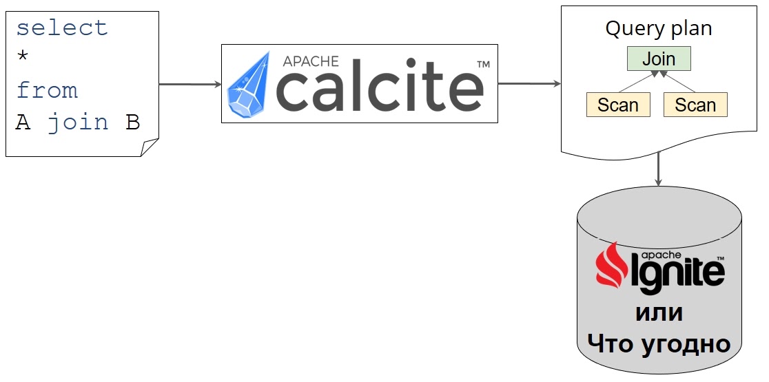 Кто-то ставит свой парсер или оптимизатор, но обычно берут все три, потому что в Calcite они уже подогнаны друг под друга, не надо ничего допиливать.