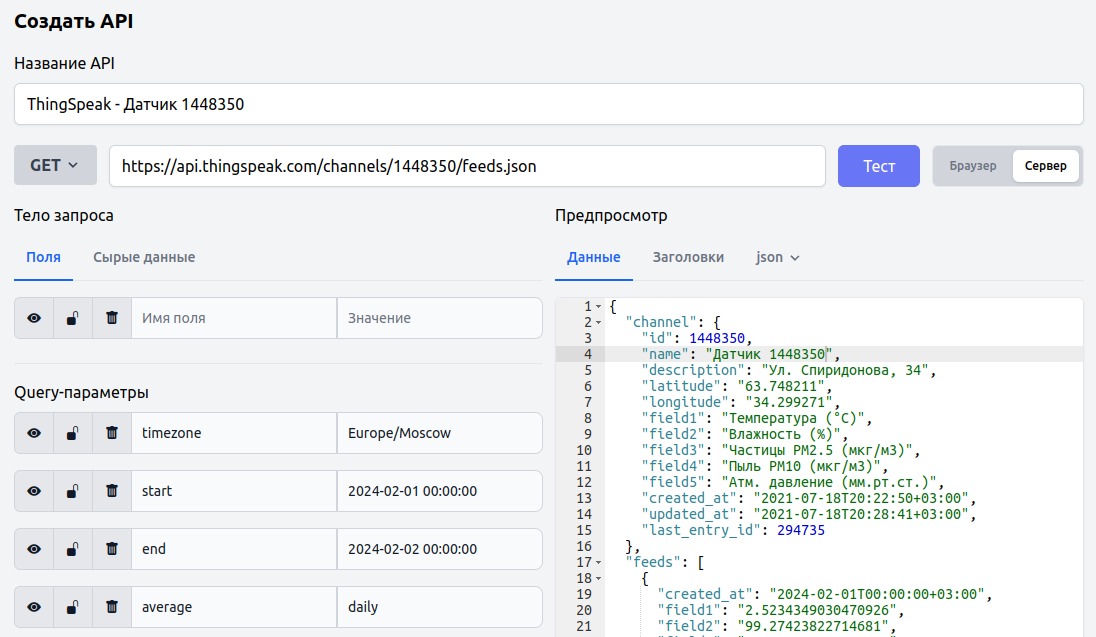 Нажав на кнопку "Тест", вижу данные, которые приходят от сервера api.thingspeak.com. Сохраняю все данные. Пришло время создать приложение для удобного управления и визуализации.