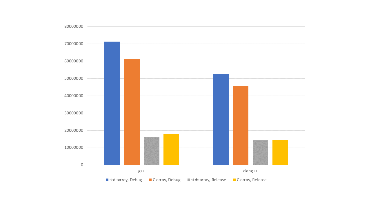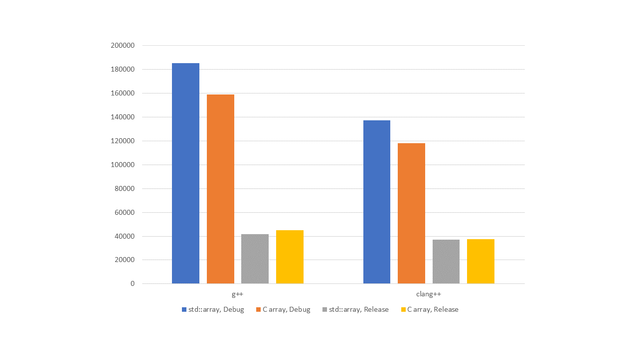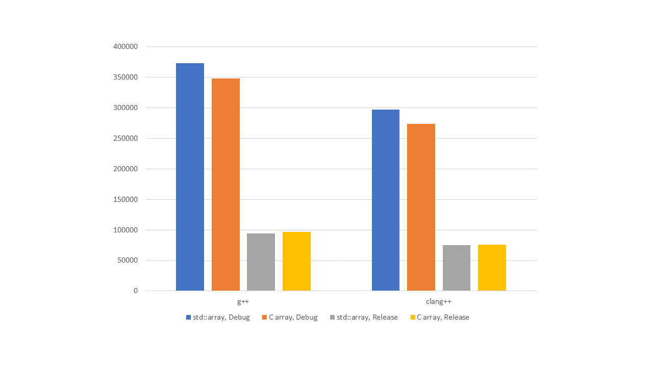 Как видно из графиков, в отладочных версиях std::array показывает меньшую производительность, чем встроенный массив. Оно и понятно, выше в ассемблере мы видели вызовы функции operator[], а они работают медленнее, чем простая адресация массива. Кроме того, исследуя реализации библиотек, мы показали, как при использовании std::array в некоторых случаях происходят дополнительные проверки на выход за границу массива.