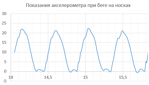 На графике выше — показания акселерометра при беге на носках. Отталкивание и амортизация при приземлении производится усилием одной ноги без касания пяткой земли. График в целом более пологий, «мягкий», практически нет ударных нагрузок (больше похож на синусоиду) и наклон кривых разгона и торможения больше из‑за того, что сила, развиваемая одной ногой меньше, чем двумя, и суммарная жесткость двух стоп и двух ахилловых сухожилий больше, чем в ситуации с работой одной ногой. Время в полете 0.1–0.15 секунды.