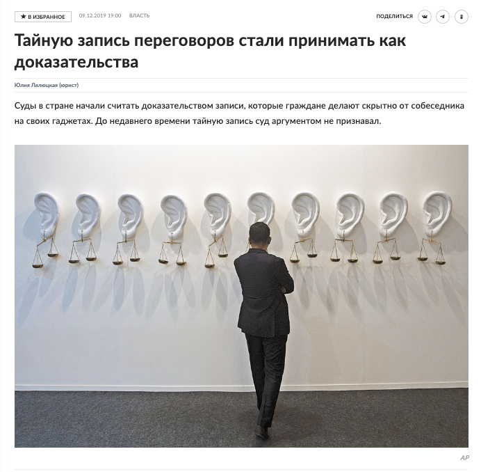 Таким образом, Верховный суд, по сути, разрешил записывать важные переговоры без согласия собеседников. Более того, под работающие диктофоны можно даже давать в долг, и запись в случае конфликта станет доказательством в суде – не хуже бумажной расписки. Самое главное: запись собственных деловых разговоров не является вмешательством в чужую частную жизнь.