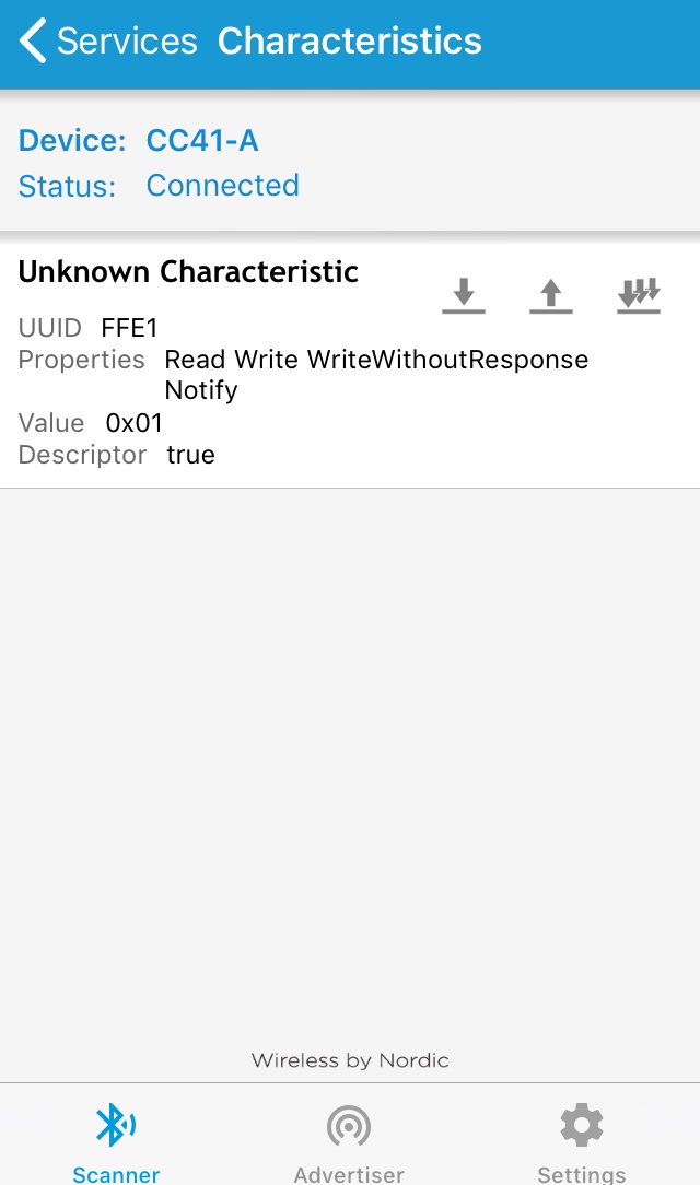 Итак, мы загрузили скетч, подключили схему к питанию. Что дальше? Для работы с Web Bluetooth API нам необходимо знать имя нашего устройства, и к какому сервису мы хотим получить доступ. Для этого можно воспользоваться приложением “nRF Connect”.