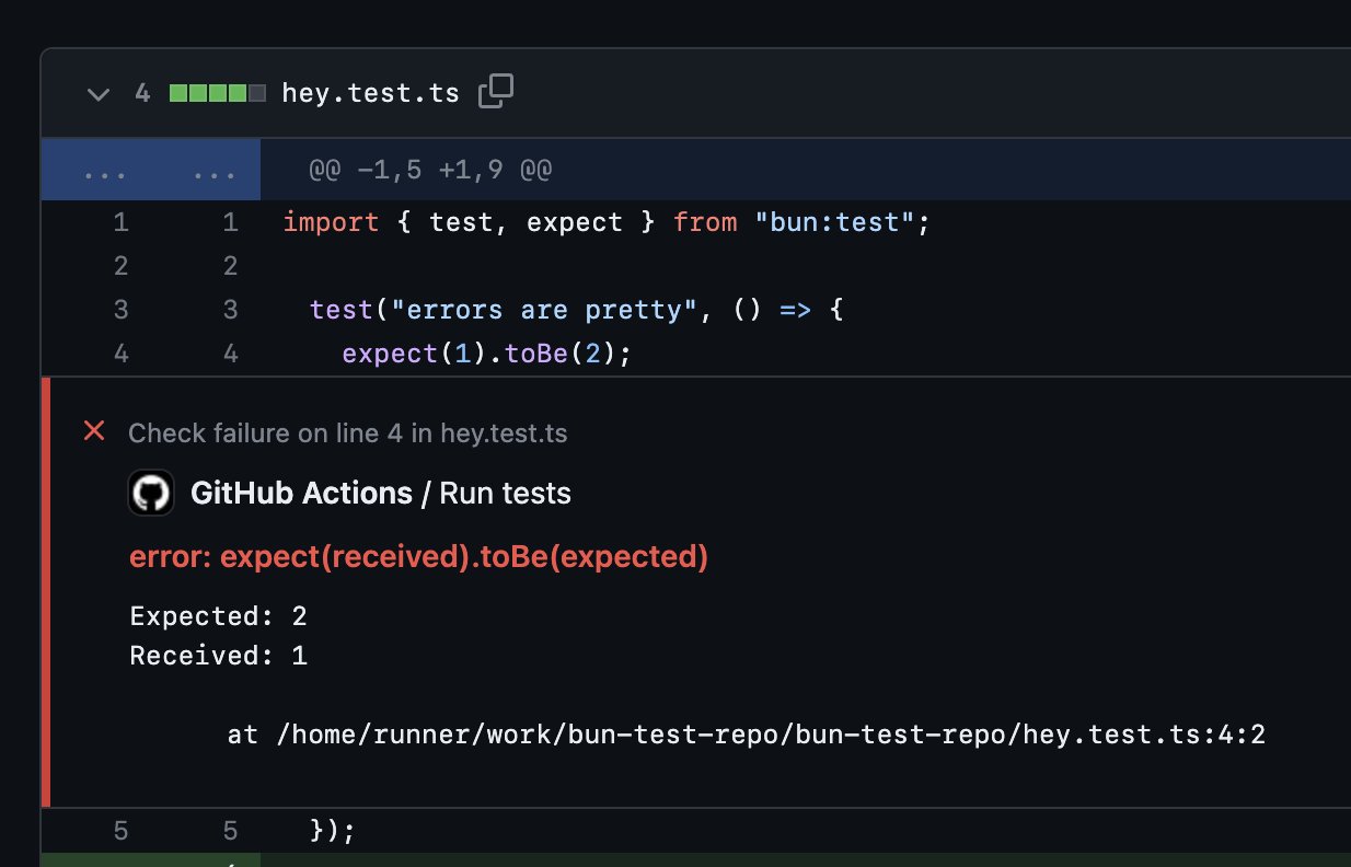 А чтобы сделать работу еще приятнее, Bun автоматически добавляет аннотации к неудачным тестам, чтобы логи CI было легче читать.