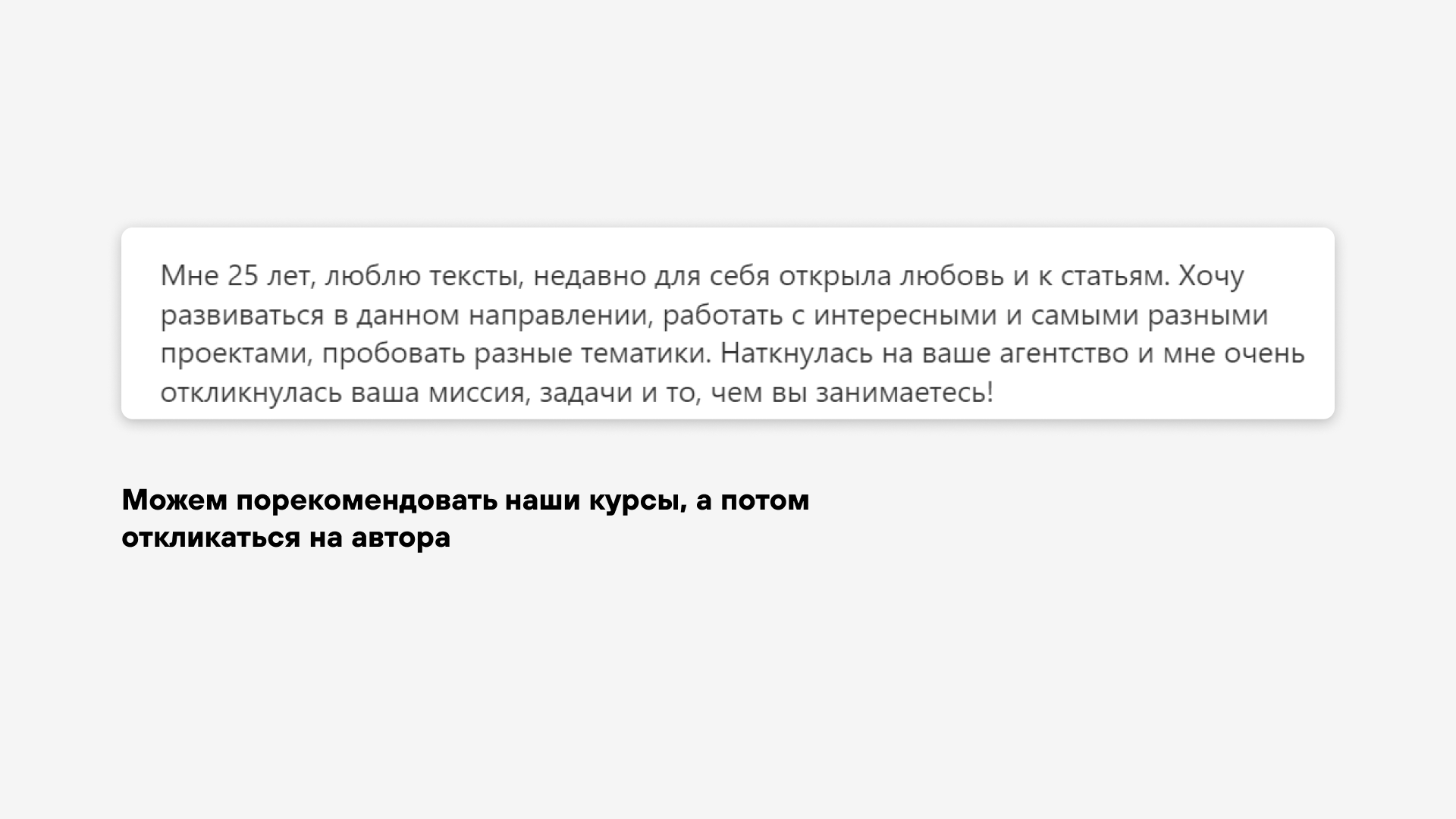 Чаще всего автор у нас растет внутри проектов — прокачивает копирайтерские скилы и учится писать в разных форматах: сегодня работает над рассылкой для Яндекса, завтра — делает лендинг для «Самолета» или пишет статью в корпоративный блог. Бывает, что заказчику нравится работать с каким-то конкретным копирайтером и он просит именно этого автора на свои задачи. Это история win-win: у автора стабильная загрузка и возможность глубоко погрузиться в проект, а заказчик получает крутые тексты, закрывающие его задачи.