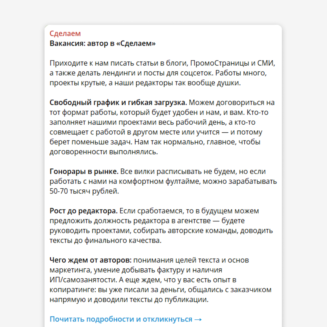 Нет смысла что-то умалчивать и приукрашивать. В тексте вакансии мы всегда отражаем все задачи, с которыми придется работать автору, и реальный уровень дохода. У нас цель — найти нужного человека, а не собрать максимальное число откликов. Потому что разбор откликов — это времязатратный процесс, который отвлекает редакторов от основных задач.