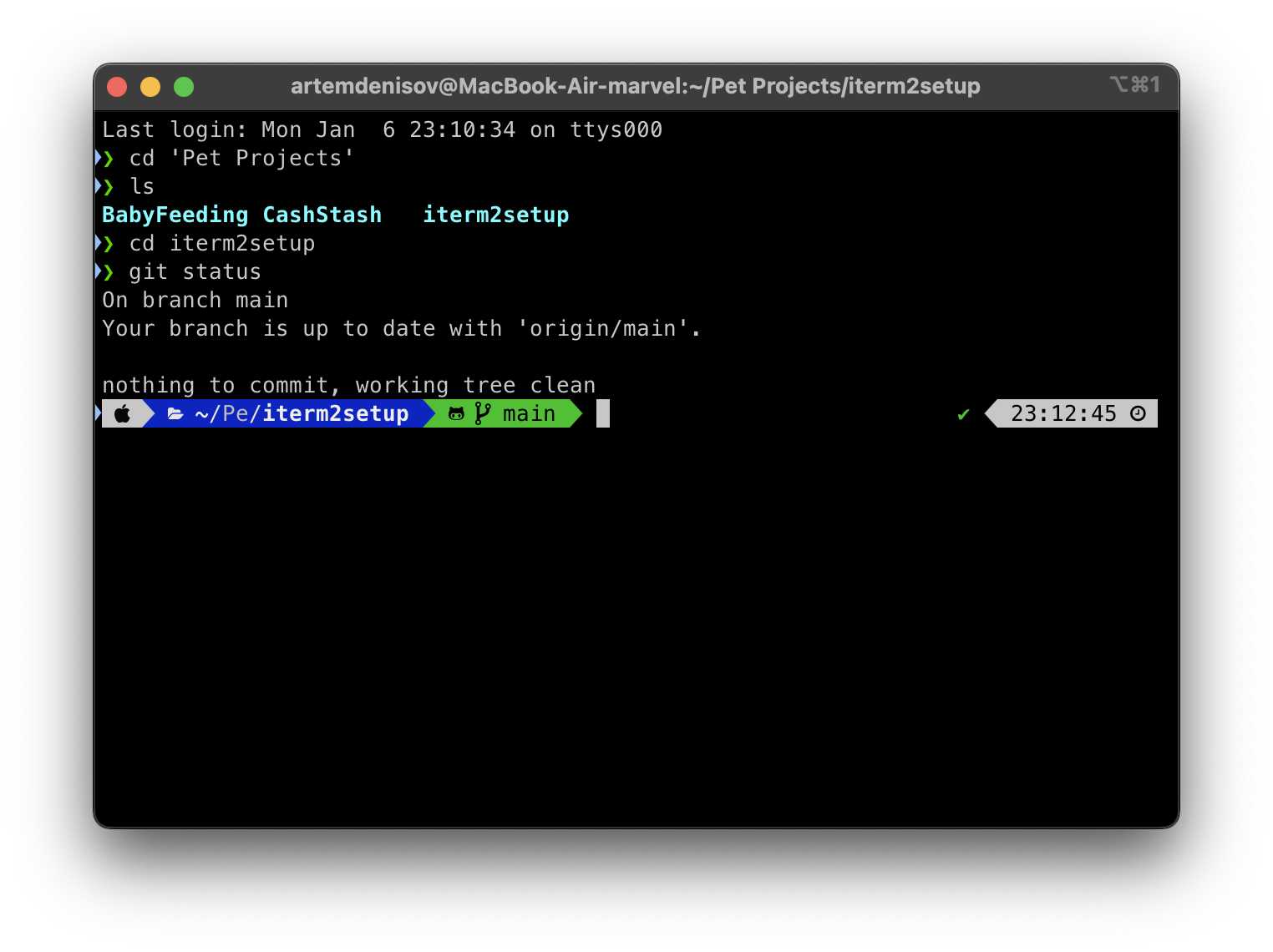 Тут уже каждый настраивает на свой вкус (если что-то пошло не так или потом захочется перенастроить — эту настройку можно будет вызвать заново). После настройки еще раз перезапускаю iTerm2 и мой результат выглядит так: